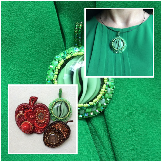 Кулон 4 см в диаметре: стекляшка, бусины, бисер чешский, Toho 15. Реальный цвет платья и кулона на фоновой фотографии коллажа - яркая травяная зелень, к осени совсем не имеющая отношения:-)